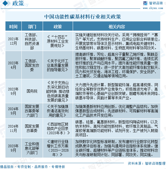 目前,我国功能性碳基材料仍处于产业化初始阶段,高强高模碳纤维、聚酰胺66等产品仍面临国际贸易和技术壁垒。此外,关键制造装备也处于以引进为主、研制和仿制为辅的状态,高端分析测试设备更是基本依赖进口,具有工匠精神的专业工程技术人才出现断层。近年来,国家相继出台一系列政策,对我国功能性碳基材料行业发展起到了规划、引导等宏观调控作用,有利于产业的健康有序发展。例如,2024年11月,国家发展改革委印发《西部地区鼓励类产业目录(2025年本)》,碳基、硅基、氟基新材料,新型结构陶瓷材料,以及纳米材料、高纯功能性新材料、岩纤维及其制品、气凝胶等高端新功能材料、试剂开发、生产被列入鼓励类项目。2025年9月,工业和信息化部等六部门印发《建材行业稳增长工作方案(2025—2026年)》,加快数字化转型标准研制,发布建材行业数字化转型成熟度评估标准,加强与通用评估指标体系衔接。健全碳纤维、超硬材料等产业链标准体系,推动材料攻关与标准研制同计划、同部署、同攻关、同实施。