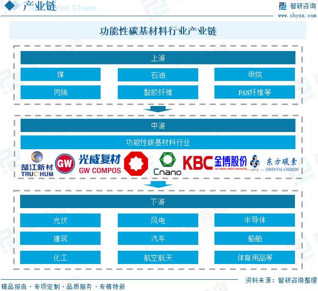 碳基材料是主要以煤、石油或它们的加工产物等有机物质作为主要原料经过一系列加工处理过程得到的一种非金属材料,其主要成分是碳。因此,功能性碳基材料产业链上游为原材料,包括煤、石油、甲烷、丙烯、黏胶纤维、PAN纤维等。产业链中游为功能性碳基材料的生产制造环节。产业链下游为应用领域,涵盖光伏、风电、半导体、建筑、汽车、船舶、化工、航空航天、体育用品等领域。