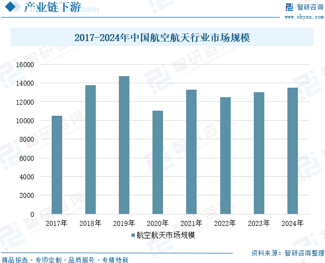 航空航天是功能性碳基材料的下游应用领域之一,主要用于制造火箭发动机喷管、航天飞机的端头帽和机翼前缘的热防护系统等关键部件。航空航天是一个涵盖航空和航天两个领域的综合性概念。航空是指载人或不载人的飞行器在地球大气层中的航行活动;航天是指载人或不载人的航天器在地球大气层之外的航行活动,又称空间飞行或宇宙航行。航空航天行业是维护国家安全和推动经济社会发展的战略性产业,具有高技术含量、高附加值、高投入产出比等特点。近年来,在政策支持和市场需求的双重驱动下,我国航空航天市场规模总体呈现出波动增长态势。数据显示,2024年中国航空航天行业市场规模为13471.08亿元,同比增长3.62%。未来,随着航空航天技术不断突破与装备升级迭代,将为功能性碳基材料带来更加广阔且高价值的发展空间。