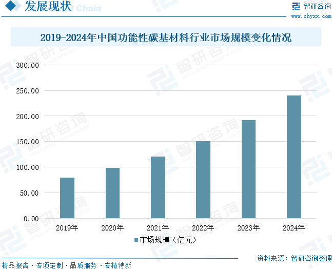 近年来,得益于碳基材料逐步渗透各个应用领域以及下游市场需求不断拓展,我国功能性碳基材料规模不断扩大。功能性碳基材料因其优异的性能,被广泛应用于多个高端领域。在航空航天领域,功能性碳基材料用于制造火箭发动机喷管、航天飞机的端头帽和机翼前缘的热防护系统等关键部件。在汽车工业中,功能性碳基材料用于刹车盘、制动盘等部件,以提高汽车的制动性能。此外,功能性碳基材料还在医学、电子、光伏发电等领域有广泛应用。这些应用普遍都有着较高的增速,是典型的新兴行业,对于功能性碳基材料的增长驱动力较强。数据显示,2019-2024年中国功能性碳基材料行业市场规模从79.92亿元增长至239.52亿元,年复合增长率为24.55%。未来,随着高端制造、绿色能源与电子信息产业的技术迭代,功能性碳基材料将在更多关键领域完成对传统材料的替代,行业规模将持续稳健扩张。