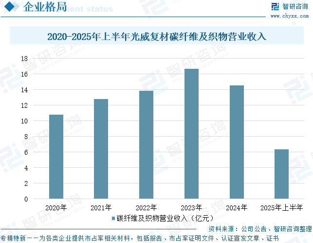 威海光威复合材料股份有限公司以国家级工业设计中心、国家认定企业技术中心、山东省碳纤维技术创新中心为支撑,业务涵盖碳纤维、经编织物和机织物、系列化的树脂体系、各种预浸料、复合材料构制件和产品的设计开发、装备设计制造、检测(CNAS/DIlAC认证国家和国防实验室)等上下游,依托在碳纤维领域的全产业链布局,成为复合材料业务的系统方案提供商。目前公司业务主要分为六大板块:碳纤维板块、通用新材料板块、能源新材料板块、复材科技板块、精密机械板块、光晟科技板块。其中,碳纤维板块坚持高强、高模、低成本的“两高一低”碳纤维业务发展战略,紧跟国际前沿和国家所需,形成系列化、多元化碳纤维、经编织物和机织物等产品。据统计,2025年上半年,光威复材碳纤维及织物营业收入为6.36亿元,同比下降6.75%。